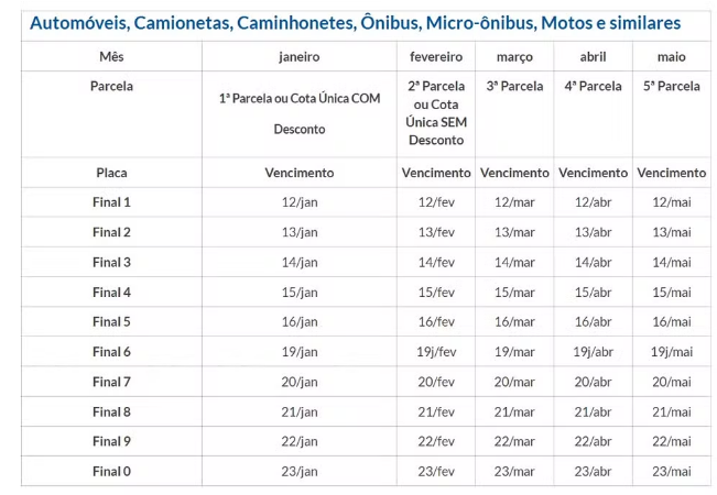 Os caminhões têm prazos diferenciados: para o pagamento integral em janeiro é concedido desconto de 3%; aos que escolherem pagar em cota única, sem desconto, é 22 de abril. Para os proprietários que optarem pelo parcelamento em três, quatro ou cinco vezes, sem desconto, os vencimentos são em 20 de março, 20 de maio, 20 de julho, 20 de agosto e 20 de setembro.